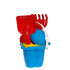 Комплектът включва кофичка със сито, лопатка, гребло и формички за пясък, изработени от висококачествена пластмаса.