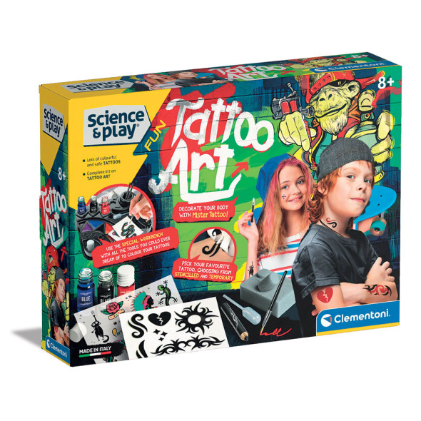 Съдържа работна маса, маркери, течни оцветители и шаблони за правене на татуировки като истински татуист!