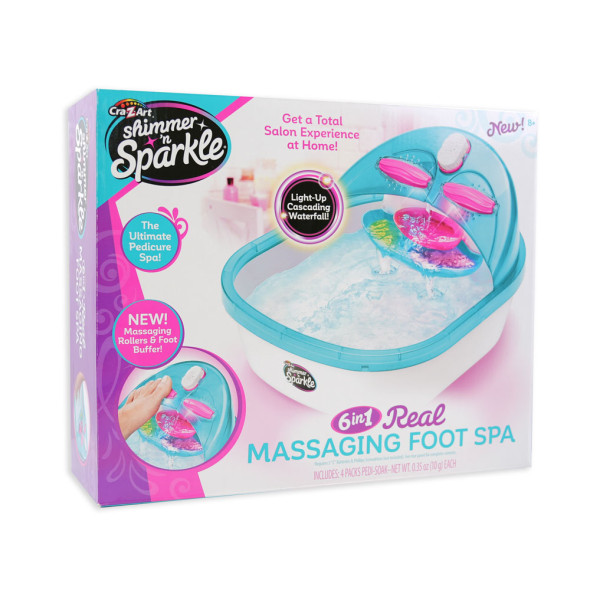 Наслади се на истинско спа удоволствие вкъщи, толкова релаксиращо и забавно! Добави вода и ароматизирани соли във ваничката Shimmer ‘n Sparkle 6 n 1 и започвай! Вълнуващите функции включват страхотен каскаден водопад, искрящи светлини и удивителни бълбукащи водни ефекти. Поглези се с педикюр и спа процедура в уюта на собствения си дом.