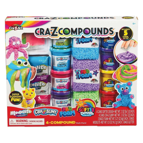 Комплектът съдържа: 4 чашки моделираща смес "тесто" 56,7 g всяка, 4 чашки с цветни желета 56,7 g всяка, 3 ппликчета цветни топчета от пяна, 5 пликчета брокат, 3 пликчета Modelite (втвърдяващ се на въздух материал) 14.2 g всяко.