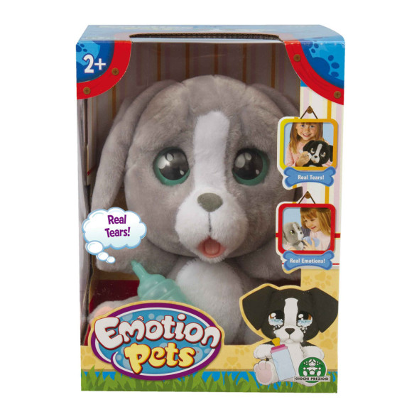 Emotion Pets са очарователни плюшени кученца, които плачат с истински сълзи, когато изпият водата от шишенцето. Подай шишенцето с вода на кученцето и то ще я изпие. Виж как очичките му се пълнят със сълзи. Стисни лапичката му и то ще заплаче с истински сълзи! Пълни шишенцето само с дестилирана вода, която не е включена в комплекта.