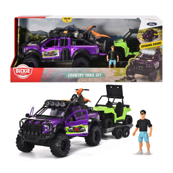 | Ford Raptor; Свободен ход; звук и светлина; Комплекта включва: 1бр. Джип; 1бр Ремарке; 1бр ATV; 1бр. Мотоциклет; 1бр. Фигура Размер: 38см. |