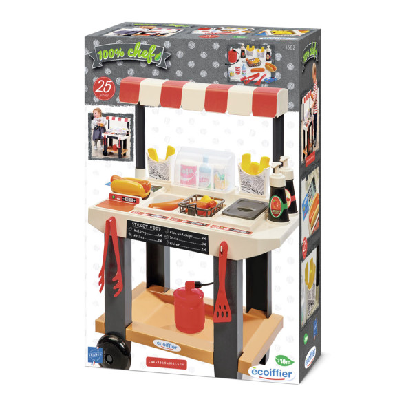 Уличната сергия предлага пържени картофки, хот-дог или пилешки хапки, а във вграденото хладилно отделение има различни безалкохолни напитки.