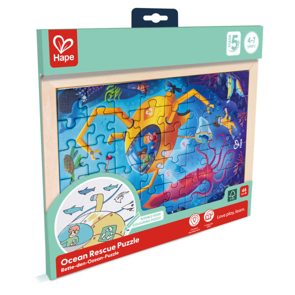 Сладките океански сцени на този двустранен пъзел включват водолази, морски обитатели, разноцветни подводни растения от едната страна. От другата, черно-бялата сцена създава възможност за творческо оцветяване.В комплекта е включен и удобен плакат, който не само помага при сглобяването, но и може да стане част от чудесната декорация на стената в стаята на вашето дете!