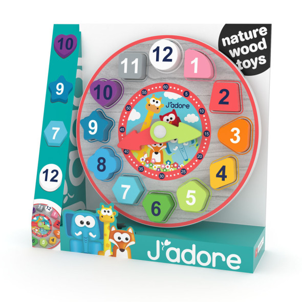 Цветен дървен часовник сортер, който ще помогне на детето да научи цифрите до 12 и да опознае различни цветове и форми.