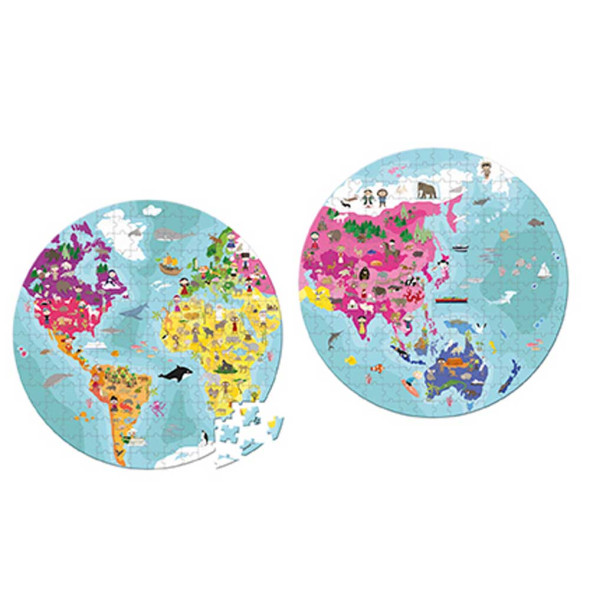 Двустранен картонен пъзел с 208 елемента и фантастична рисунка на нашата планета, с океаните, континентите и техните обитатели,