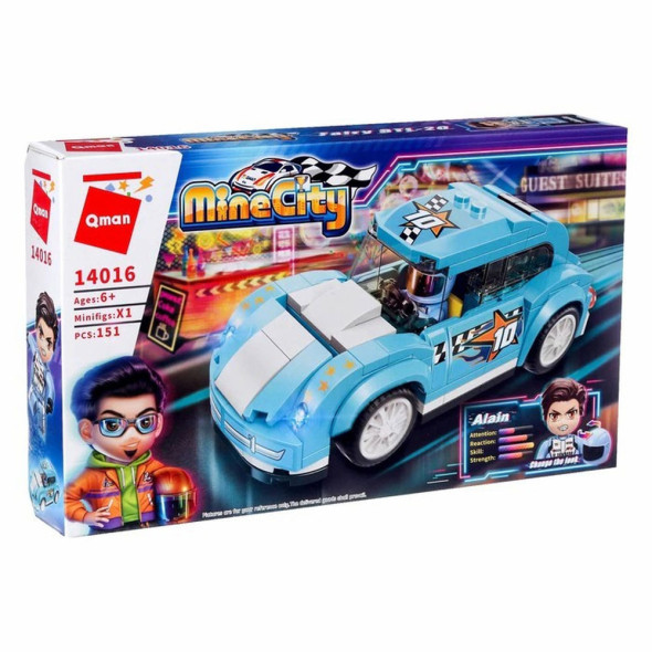 Комплект състезателна кола с фигурка. Частите са украсени със стикери от елементи от състезания.