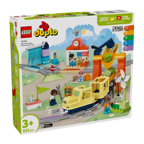 Децата на възраст над 3 години потеглят на пътешествие с въображение с комплекта „Голям влак за взаимодействия“ (10428). Този динамичен комплект за игра има множество възможности и функции, включва 4 разнообразни фигури и обещава часове завладяващо учене. Образователното пътуване на малките деца започва на гарата от комплекта. Децата в предучилищна възраст използват творческо мислене при измислянето на маршрута за влака „бутни за тръгване“ и в движение изпълняват забавни задачи за решаване на проблеми. Децата могат да товарят влака с товар, да зареждат двигателя или да мият вагоните. Всяка дейност оживява със светлини и звуци, когато влакът премине върху една от 5-те тухлички за действие. Комплектът помага и за развитие на търпение и любопитство, докато децата експериментират с нови начини на построяване на релсите. Безплатното приложение LEGO® DUPLO® Interactive Trains позволява на децата да записват собствени знаци за пътуването на влака и да управляват локомотива с преносимо електронно устройство, и вдъхновява цялото семейство да създава различни конструкции.