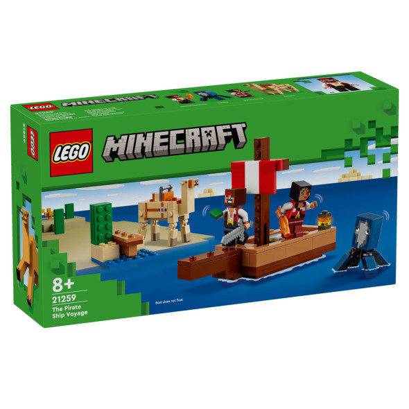 Пътуването на пиратския кораб (21259) е приключенски комплект Minecraft® с фигури на пирати, с който може да се играе отделно или да се комбинира с други комплекти (продават се отделно) за създаване на по-мащабни игри. Този комплект за игра с пиратски кораб е универсален подарък за конструиране за играчи на Minecraft и момчета и момичета на възраст над 8 години, които харесват кораби и строителни забавления. Този комплект LEGO Minecraft за пиратски приключения включва кораб за конструиране, сепия, камила, 2 фигури на пирати и аксесоари. Този специален комплект LEGO предлага пирати, кораб и за пръв път възрастна камила LEGO Minecraft, ще се хареса на феновете на Minecraft. Двуместното седло на камилата е достатъчно и за двамата пирати, за да потеглят към следващото си приключение. Аксесоарите, включително риба, карта, железен меч и кактус, вдъхновяват игри с въображение. Комплектът се комбинира с други комплекти LEGO Minecraft (продават се отделно) за още повече възможности за игра.