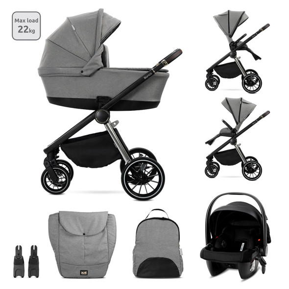 Комбинирана количка 3в1 BIANKA включва: рама, кош за новородено, седяща част, столче за кола-кошница (40-87см), адаптори и чанта/раница за аксесоари.