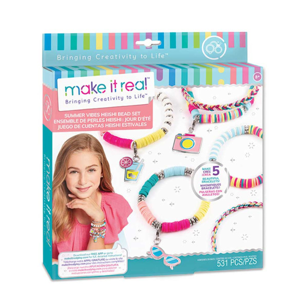 Комплектът съдържа: 480 плоски мъниста "heishi", 35 сребристи мъниста, 2 м корда, голям и малък метален ринг, 1 закопчалка за бижу, 6 цв. х 2 м конци, 3 талисмана, работна основа.