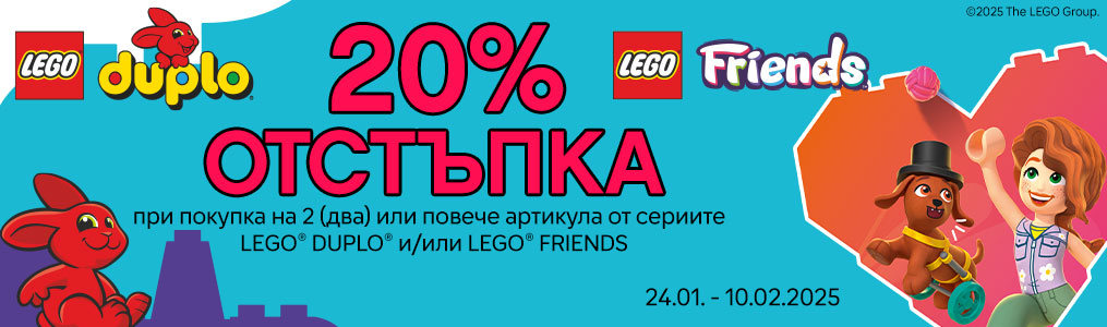 Oтcтъпĸaтa oт 20% вaжи пpи пoĸyпĸa нa 2 (два) или повече артикула от артикула от сериите LEGO DUPLO и (или) LEGO Friends, в eдин ĸacoв бoн.