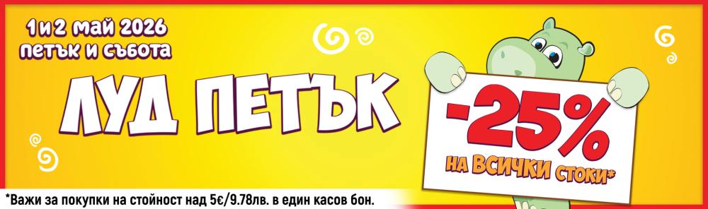 В дните на ЛУД ПЕТЪК ще се пазарува само с 25% отстъпка при покупка на стойност над 5 евро / 9.78 лв. в един касов бон. На 01.05. и 02.05.2026 г. не са валидни никакви други карти за отстъпка /Хипо +, Хипо VIP, Хипо LEGO Клуб, програми за лоялност с банки, молове и др./, които приемаме в другите дни на годината.