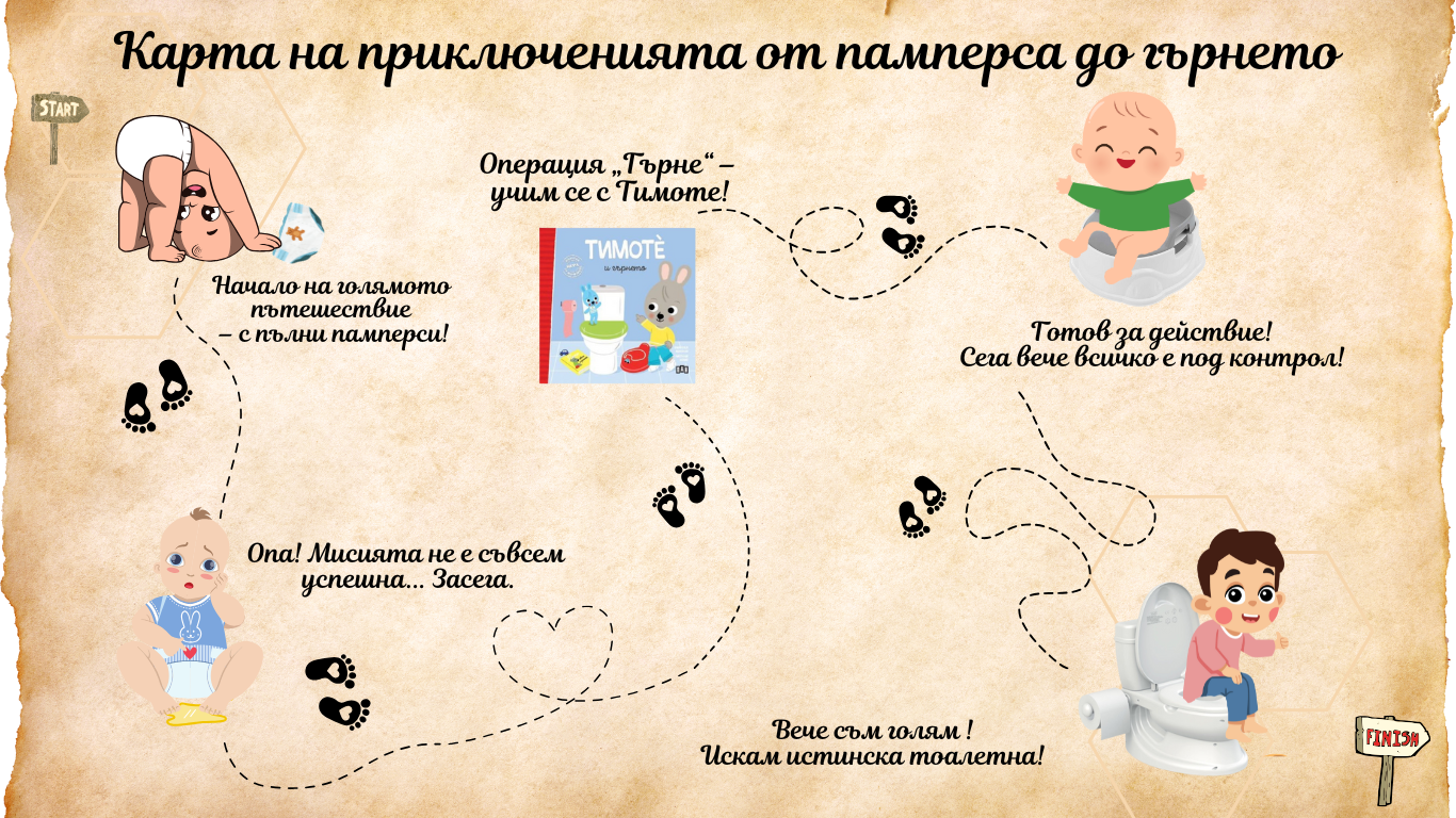 Отказването от памперси е голяма стъпка както за детето, така и за родителите. Това е време на промени, емоции и много нови умения, които малчуганите трябва да усвоят. И макар че този процес често може да изглежда предизвикателен, с правилната подготовка и малко търпение, той може да стане дори забавен. В тази статия ще разгледаме как родителите могат да помогнат на своето дете по пътя от памперса до гърнето, като използват една забавна карта с малки стъпки, които правят този път по-лесен и интересен.