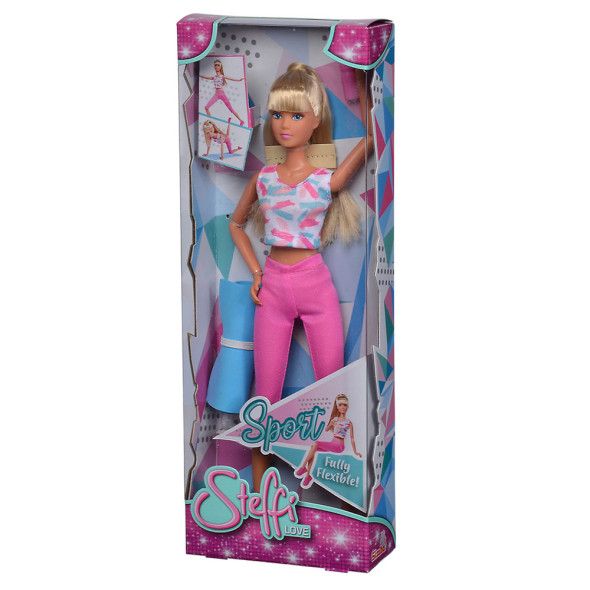 Кукла за обличане - Steffi LOVE е истинска модна кукла. Тя обича шикозни дрехи, модерни прически, малката си сестра Еви и разбира се гаджето си Кевин. Момичетата могат да оформят и обличат куклата си по най-новите модни тенденции.Стефи, облечена в спортно облекло, с напълно съчленено тяло, 14 стави, със спортна постелка и бутилка за пиене на вода.