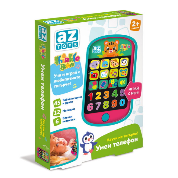 С този забавен смартфон малкото дете ще опознае света на веселото бебе тигърче и неговите приятели, овладявайки числата, цветовете, формите и азбуката.