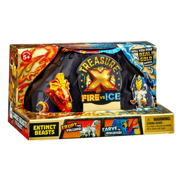 Търсенето на златното съкровище продължава с Treasure X - Beasts S4! Очаква те приключение в 10 стъпки. Отвори гърлото на вулкана и напълни с вода. Вулканът ще изригне. Вътре се крие огнен или леден звяр. След изригването освободи основата на вулкана от лепенката. Махни черупката на вулкана и продължи с вълшебния восък. С помощта на инструмента нарежи ваксата на тънки слоеве от всички страни, докато откриеш потайностите вътре. С инструмента отвори метеора и разбери дали "златното" съкровище е твое! Събери всички изкопани части и сглоби древния звяр! Цялата колекция включва 6 различни звяра.